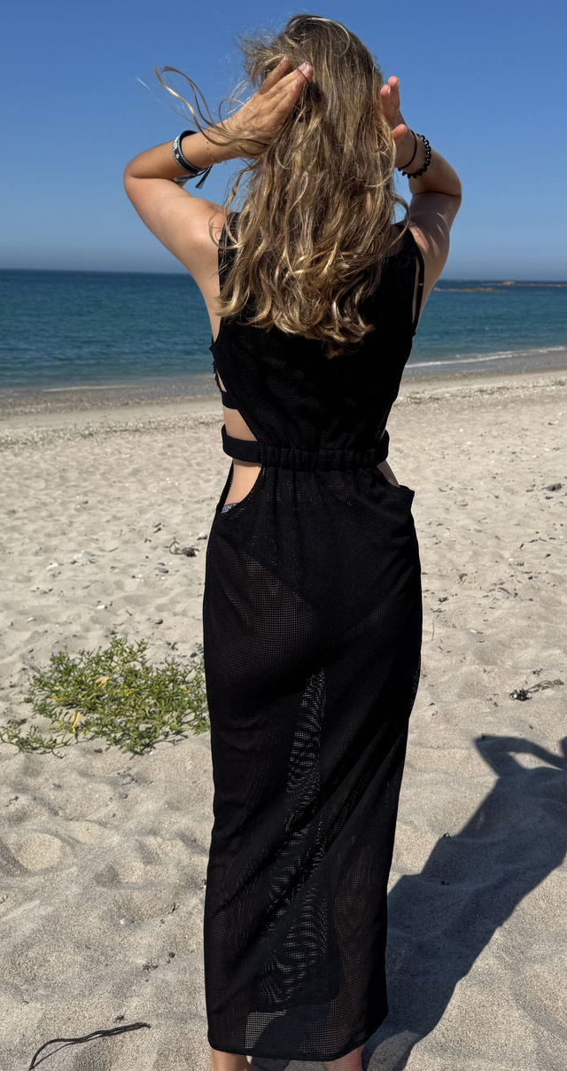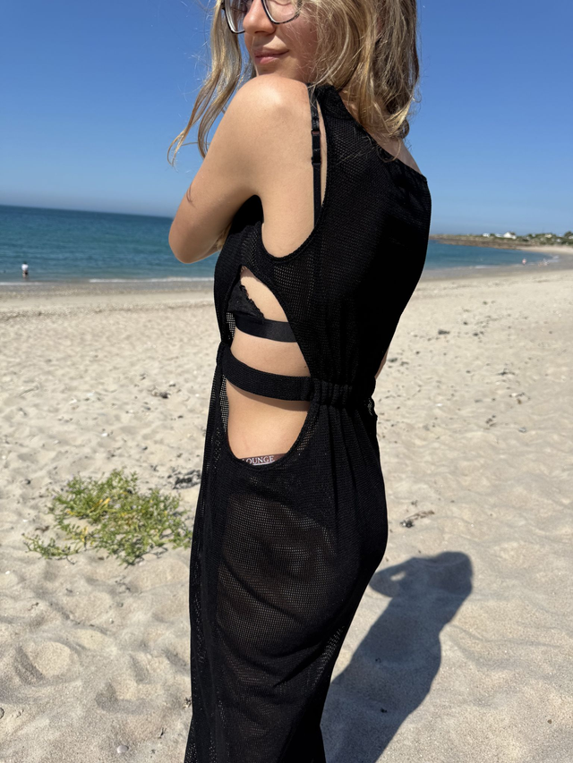 La robe ELLA évoque la fluidité et liberté du littoral. Confectionnée dans une maille ajourée noire, elle joue sur la transparence et les jeux de lumière, rappelant les reflets mouvants de l'eau. Ses découpes latérales dessinent subtilement la silhouette, tandis que la matière souple épouse le corps sans contrainte.