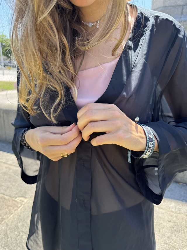 - D'une chemise noire en mousseline asymétrique fermé par des boutons en bois