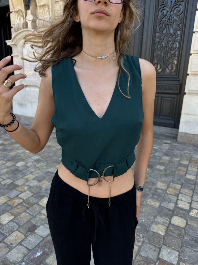 Au milieu devant, une broche en métal doré s'impose comme un bijou, transformant la pièce en accessoire d'élégance à part entière. Sans manches, il s'adapte à toutes les saisons, porté seul ou glissé sous une veste.